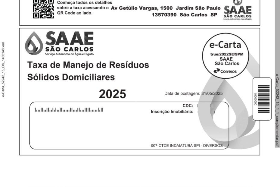 Contribuintes devem manter o cadastro atualizado para garantir o recebimento do carnê e evitar pendências no pagamento. O Serviço Autônomo de Água e Esgoto de… Continue a ler »SAAE INICIA ENTREGA DOS CARNÊS DA TAXA DE MANEJO DE RESÍDUOS SÓLIDOS DOMICILIARES (TMRSD)
