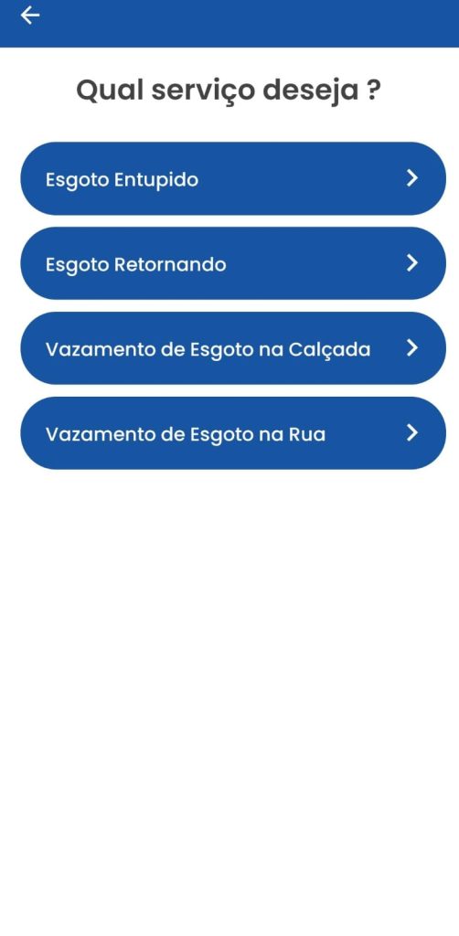 ÁGUA E ESGOTO – Com relação específica a água, o usuário pode comunicar e pedir a solução de falta de água na residência; falta de água na rua; vazamento de água na calçada; vazamento de água na rua; vazamento de água na caixa padrão; vazamento de água em cavalete. Referente a esgoto, pode haver comunicação de esgoto entupido; esgoto retornando; vazamento de esgoto na calçada; vazamento de esgoto na rua.
