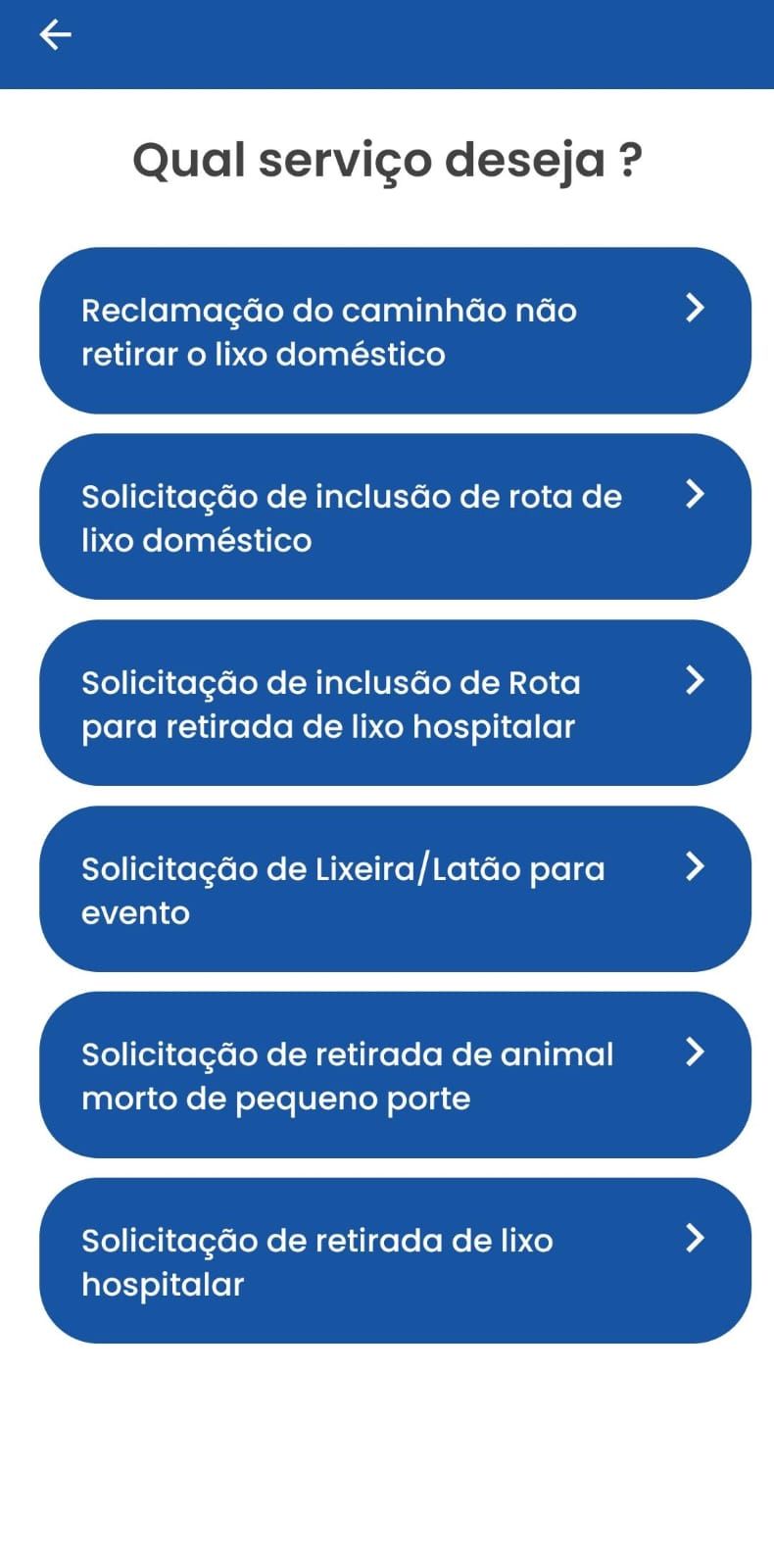 RESÍDUOS E DRENAGEM – Já no que se refere a resíduos, é possível comunicado de que caminhão não retirou lixo doméstico; solicitação de inclusão de rota para retirada de lixo doméstico; solicitação de inclusão de rota para retirada de lixo hospitalar; solicitação de lixeira/latão para evento; solicitação de retirada de animal morto de pequeno porte; solicitação de retirada de lixo hospitalar. Na área da drenagem, boca de lobo entupida; boca de lobo sem grade ou laje; água parada; erosão em córrego ou canal; limpeza de piscinão; galeria pluvial entupida; galeria pluvial quebrada.