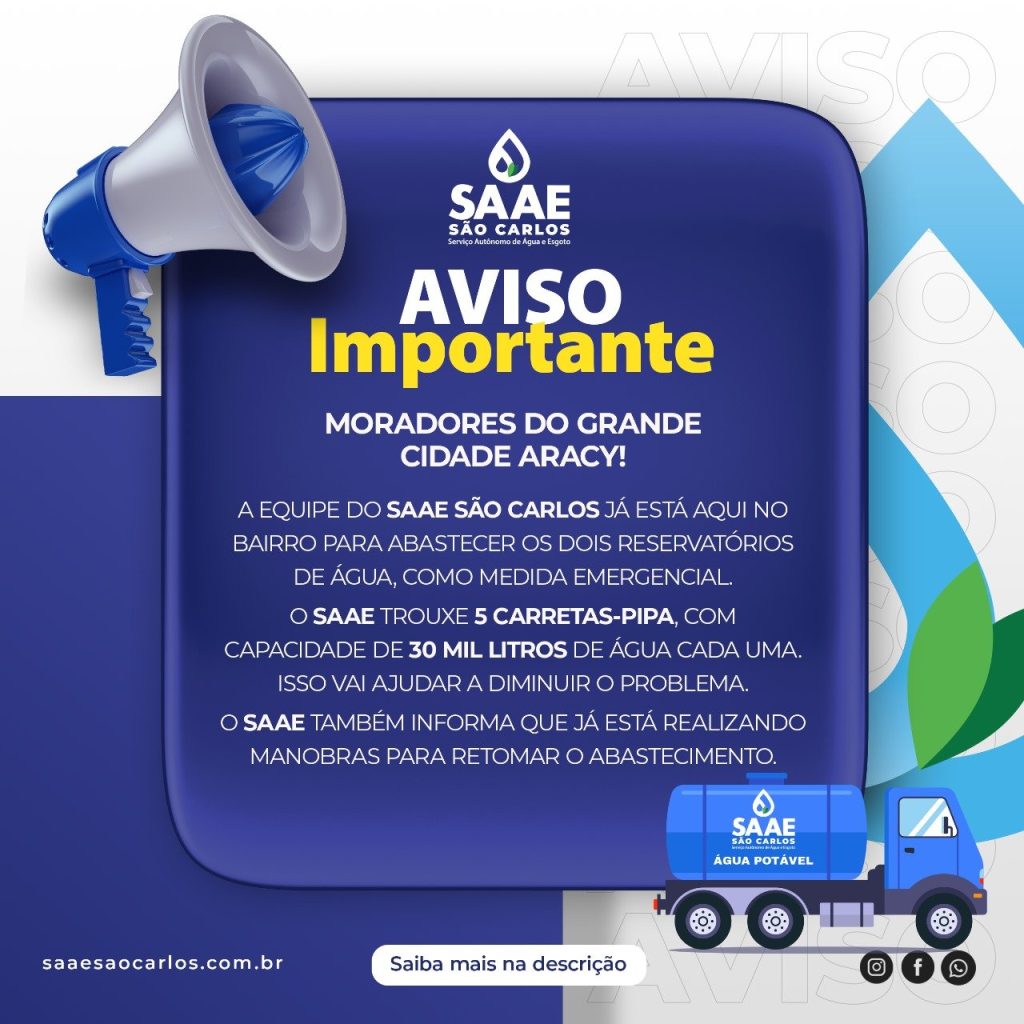 A equipe do SAAE São Carlos já está na região com caminhões pipa para ajudar no abastecimento.