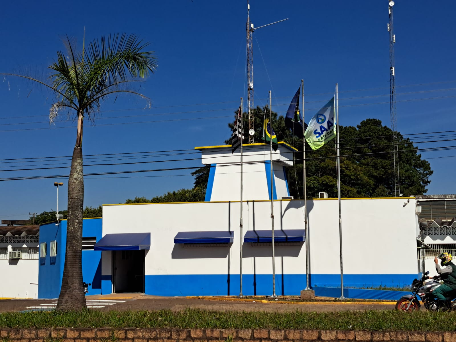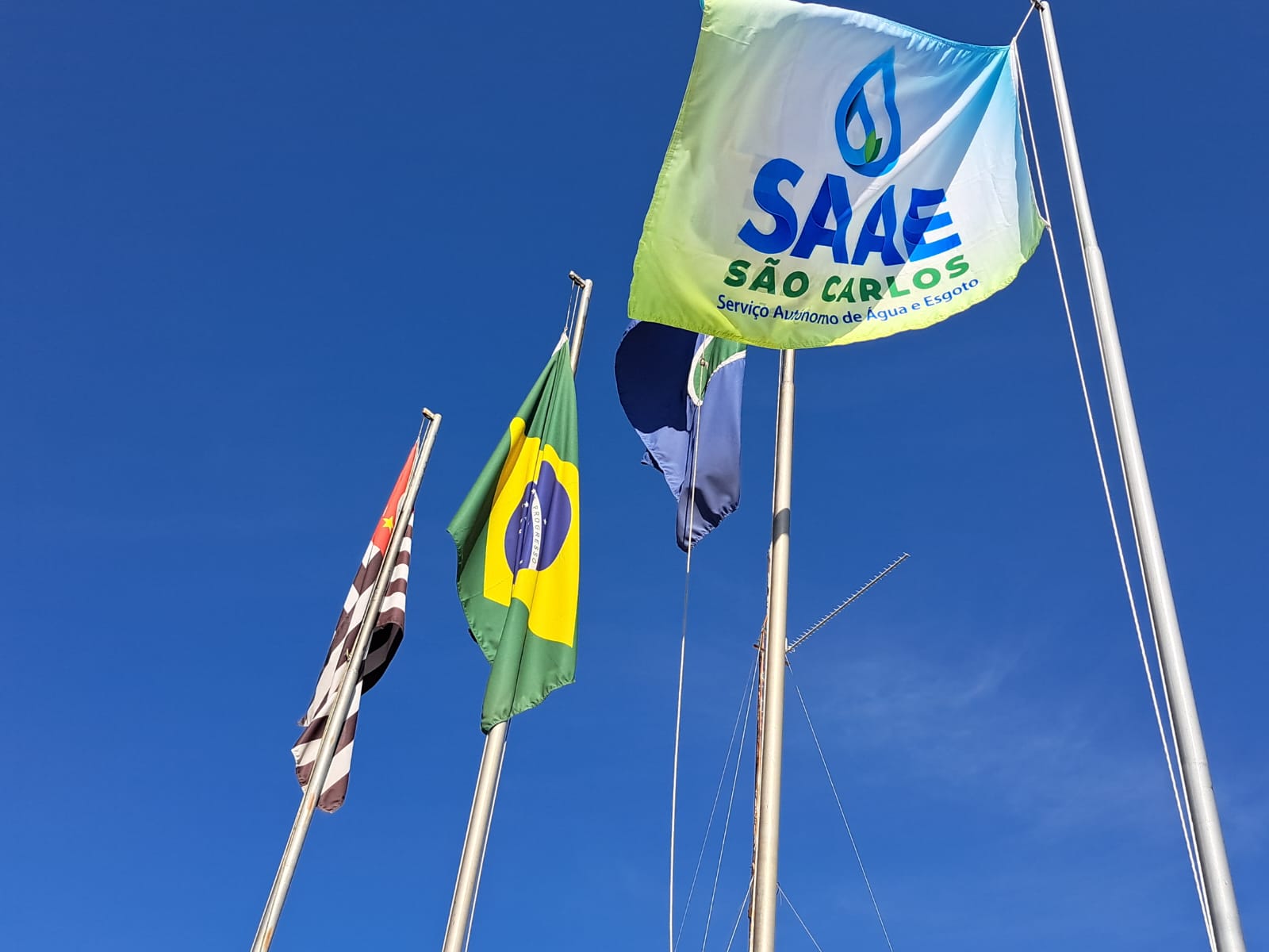 O Serviço Autônomo de Água e Esgoto de São Carlos (SAAE) colocou a bandeira da autarquia no quarto mastro na frente da sede administrativa na Avenida Getúlio Vargas, conforme orienta a ordem pelo protocolo oficial. Já estampada com a nova logomarca, lançada e apresentada ao público no último dia 26 de junho durante as comemorações dos 54 anos do SAAE, ela está ao lado das bandeiras do Estado de São Paulo, do Brasil e da cidade de São Carlos.