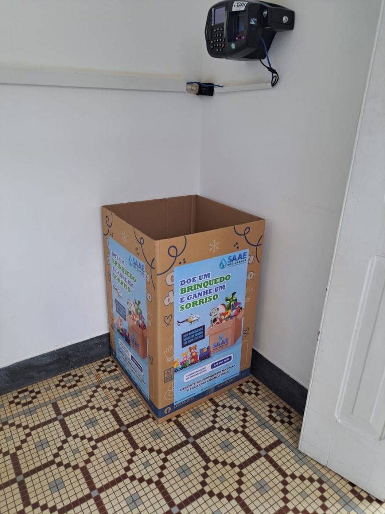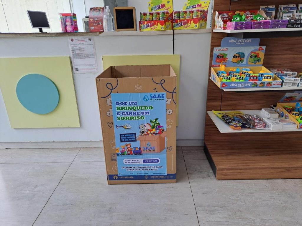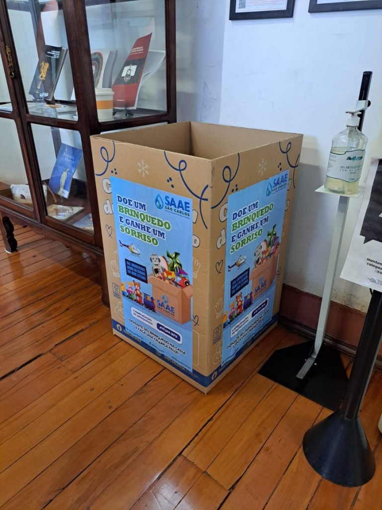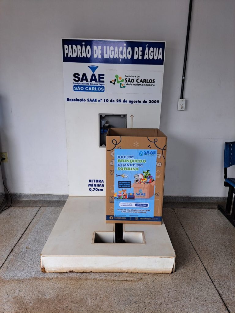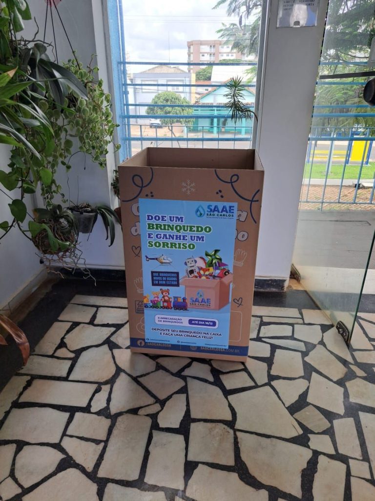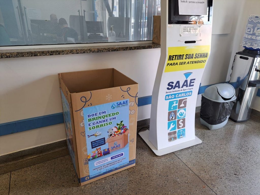 O Serviço Autônomo de Água e Esgoto de São Carlos (SAAE) informa que as caixas de coleta da segunda campanha de arrecadação de brinquedos novos ou usados, com o nome ‘Doe um brinquedo e ganhe um sorriso’, já estão à disposição dos servidores e do público em geral na sede administrativa, na Avenida Getúlio Vargas, 1.500, nas unidades de atendimento presencial (Vila Prado, Centro, Santa Felícia, Cidade Aracy e Distrito de Santa Eudóxia), Estação de Tratamento de Água – ETA Vila Pureza, na Avenida Dr. Carlos Botelho, e Estação de Tratamento de Esgoto – ETE Monjolinho.