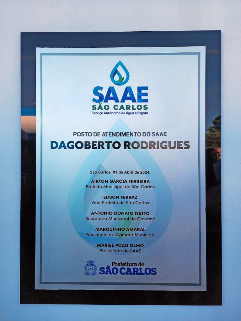 Com a presença de diversos servidores, além de vários vereadores, secretários municipais e também da família do homenageado, o Serviço Autônomo de Água e Esgoto de São Carlos (SAAE) inaugurou nesta segunda-feira, 01/04, às 9h, o Posto de Atendimento “Dagoberto Rodrigues”, na Rua Francisco Possa, 1.450, na grande Santa Felícia. A exemplo dos demais espaços de atendimento presencial do SAAE, o posto estará aberto das 8h às 16h, com três funcionários.