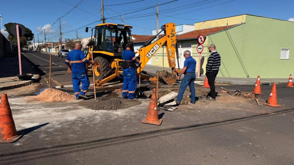 Na sequência, os gestores acompanharam os trabalhos de substituição de laje em poço de visita e manutenção no sistema de drenagem da Vila Prado, nas imediações do Estádio Municipal Professor Luís Augusto de Oliveira. A intervenção tem como objetivo melhorar o escoamento das águas pluviais na região, com mais segurança ao tráfego de veículos.