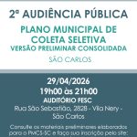O Serviço Autônomo de Água e Esgoto de São Carlos (SAAE), em parceria com a VITA Engenharia e Consultoria Ambiental, realiza no próximo dia 29 de abril de 2026, quarta-feira, das 19h às 21h, a 2ª Audiência Pública do Plano Municipal de Coleta Seletiva de São Carlos (PMCS-SC). O encontro acontecerá no Auditório FESC, localizado na Rua São Sebastião, nº 2828, Vila Nery.