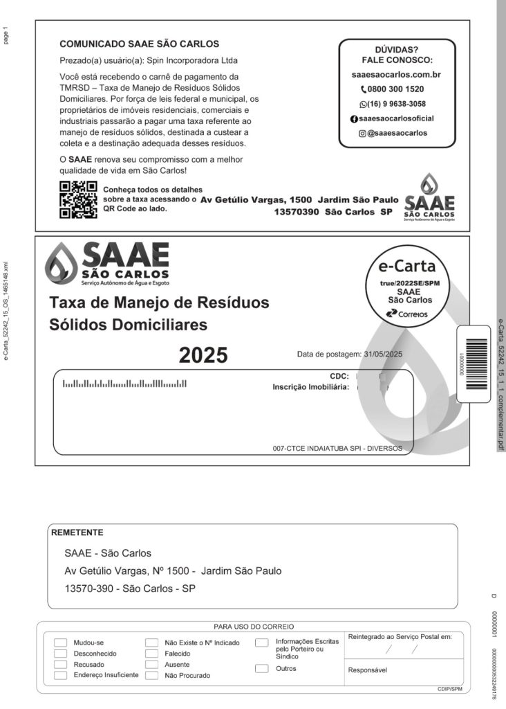 O Serviço Autônomo de Água e Esgoto de São Carlos (SAAE) informa que os Correios já iniciaram a entrega dos carnês da Taxa de Manejo de Resíduos Sólidos Domiciliares (TMRSD). O boleto será encaminhado diretamente para o endereço do proprietário.