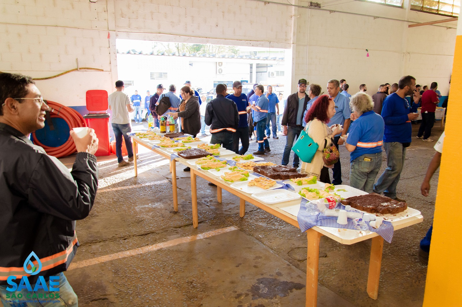 O Serviço Autônomo de Água e Esgoto (SAAE) de São Carlos serviu um café da manhã nesta sexta-feira, 11/08, antevéspera do Dia dos Pais, que será comemorado neste domingo, 13/08. O encontro entre os funcionários foi no Barracão do Setor de Transportes, na sede administrativa da Avenida Getúlio Vargas, e reuniu vários servidores das diversas unidades da autarquia. O SAAE tem, hoje, 461 funcionários. 348 são homens e, deste total, 280 são pais.