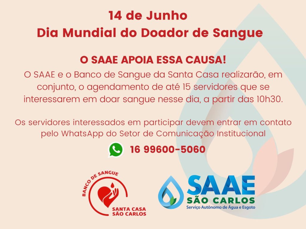 Para lembrar a importância da doação de sangue, o Serviço Autônomo de Água e Esgoto de São Carlos (SAAE) realizou nesta sexta-feira, 14/06, ‘Dia Mundial do Doador de Sangue’, um reforço para o Banco de Sangue da Santa Casa com a participação de diversos colaboradores da autarquia que foram, de forma espontânea e voluntária, até o hospital praticar o gesto de solidariedade que ajuda a salvar muitas vidas.