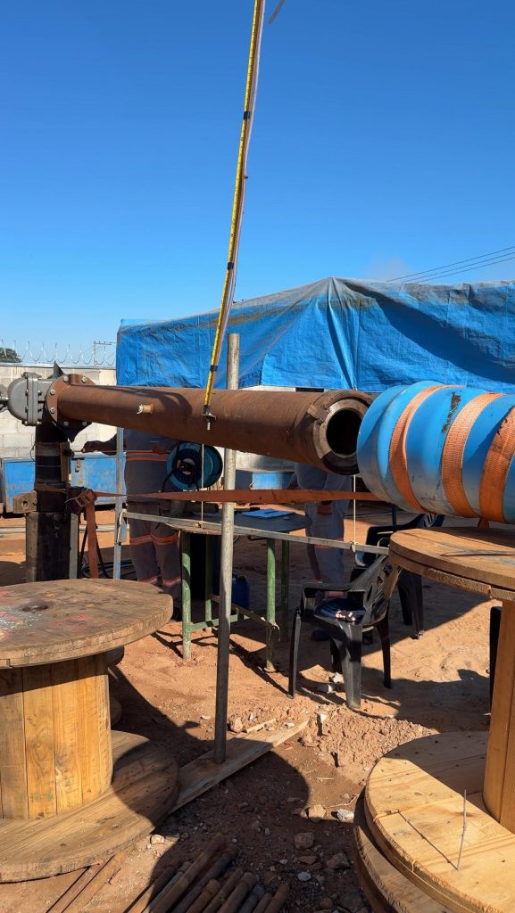 O teste, que tem duração de 24 horas, é realizado com uma bomba específica e monitorado continuamente para aferição do nível dinâmico da água. A partir desses dados, são feitos os cálculos que definirão o tipo ideal de bomba a ser instalada, garantindo a máxima eficiência do poço. Após essa fase, ainda serão realizadas mais três etapas, incluindo o último teste de vazão, que confirmará a capacidade do poço após a instalação da bomba definitiva.