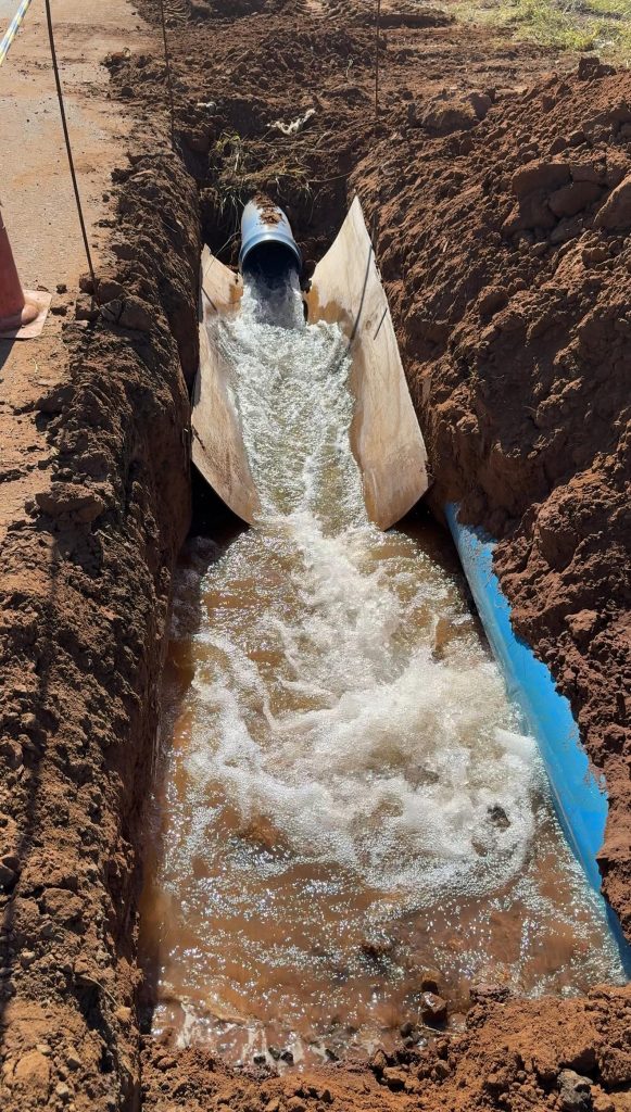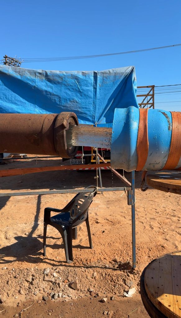 ETAPAS DA OBRA – Com 326 metros de profundidade e vazão estimada em 200 m³/h, o poço será integrado a um reservatório metálico apoiado com capacidade de 2.650 m³ de água, o equivalente a 2 milhões e 650 mil litros. Antes do teste preliminar, cinco etapas essenciais já haviam sido concluídas com êxito: perfuração do poço, introdução dos tubos de revestimento, colocação do pré-filtro (com areia de granulometria controlada), lavagem do poço e desenvolvimento da vazão.