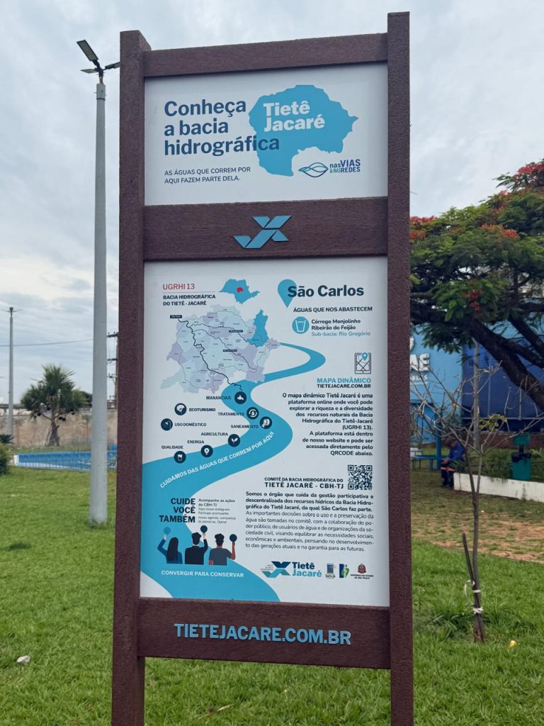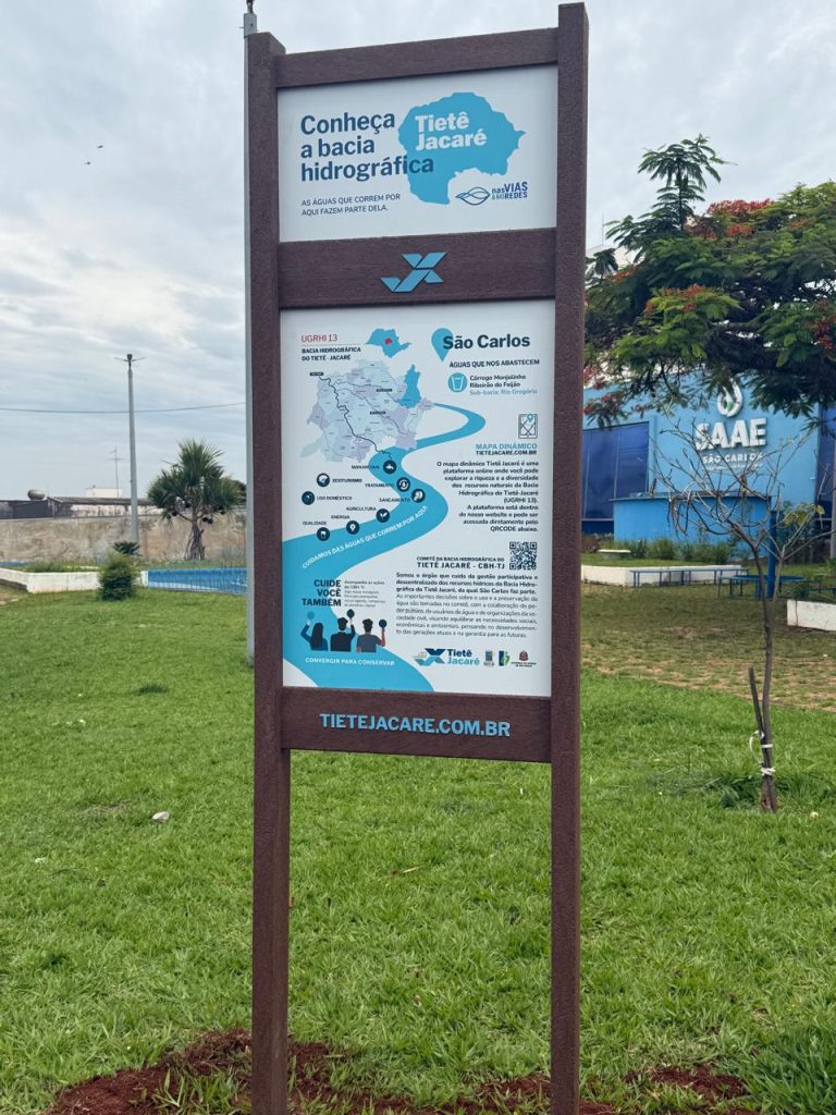 A placa informativa, produzida em formato de Totem, apresenta um mapa dinâmico da Bacia Hidrográfica, acessível por meio de QR Code. Ao escanear o código, o visitante é direcionado à plataforma tietejacare.com.br, onde é possível explorar as características e a diversidade dos recursos naturais da região, com conteúdo personalizado para cada município integrante da bacia.