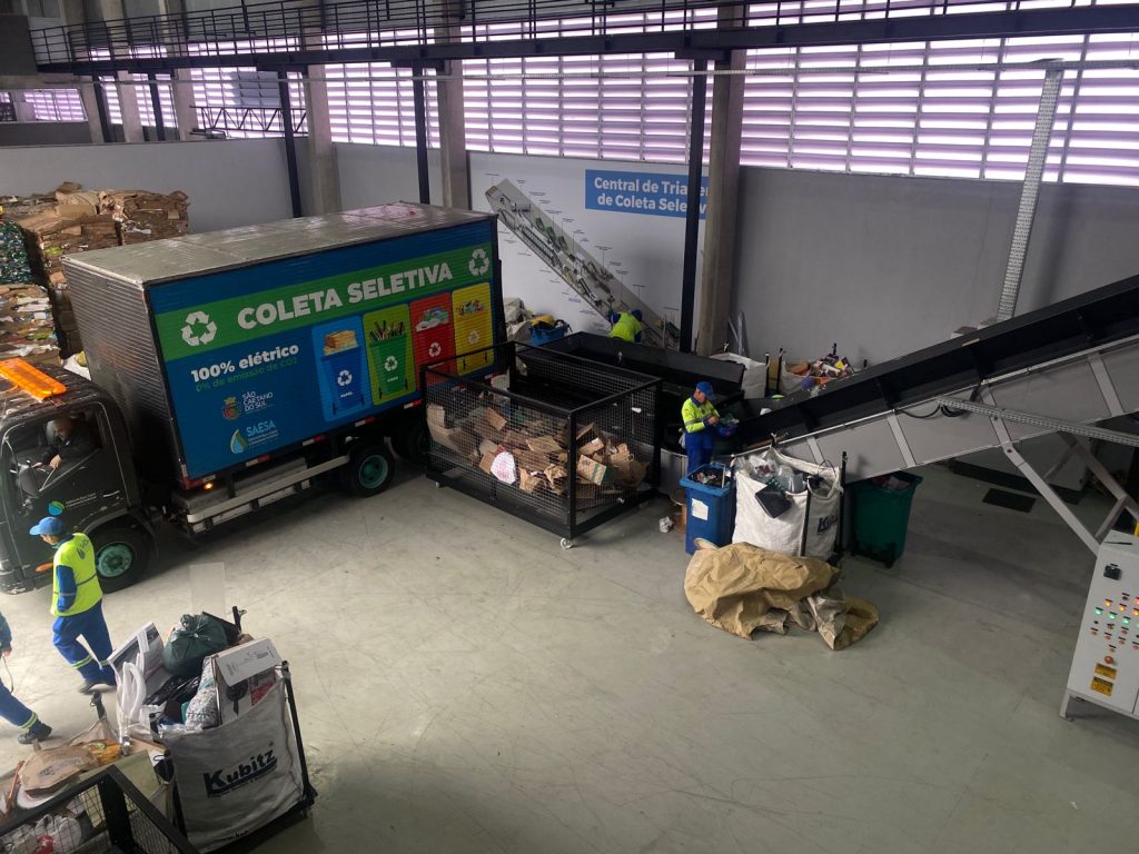 MODERNIZAÇÃO NA COLETA SELETIVA – A primeira visita ocorreu na Central de Triagem de Coleta Seletiva do SAESA. A estrutura é referência em gestão eficiente de resíduos sólidos, contando com maquinários e equipamentos modernos que ampliam a capacidade de triagem e tratamento dos materiais recicláveis. Ao mesmo tempo em que agrega produtividade, o equipamento proporciona mais segurança e ergonomia aos trabalhadores. Na central, os resíduos são separados por categorias, para após serem prensados em medidas padronizadas para posterior comercialização. Apenas os rejeitos não recicláveis são destinados ao aterro sanitário. A esteira de triagem proporciona agilidade e organização na separação dos resíduos.