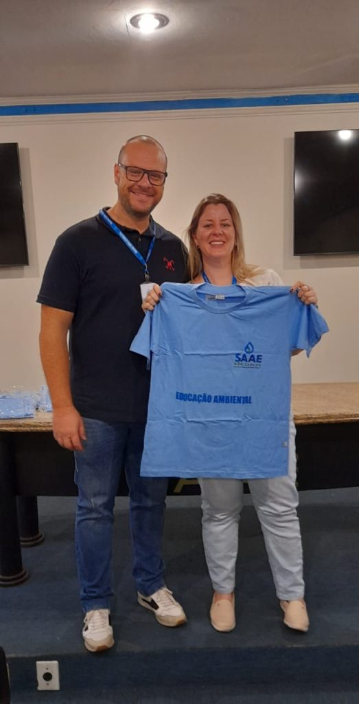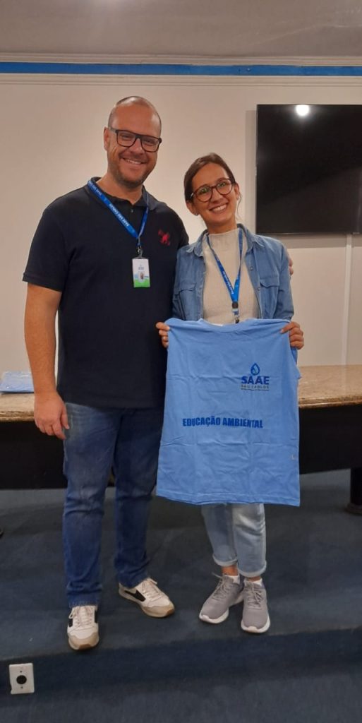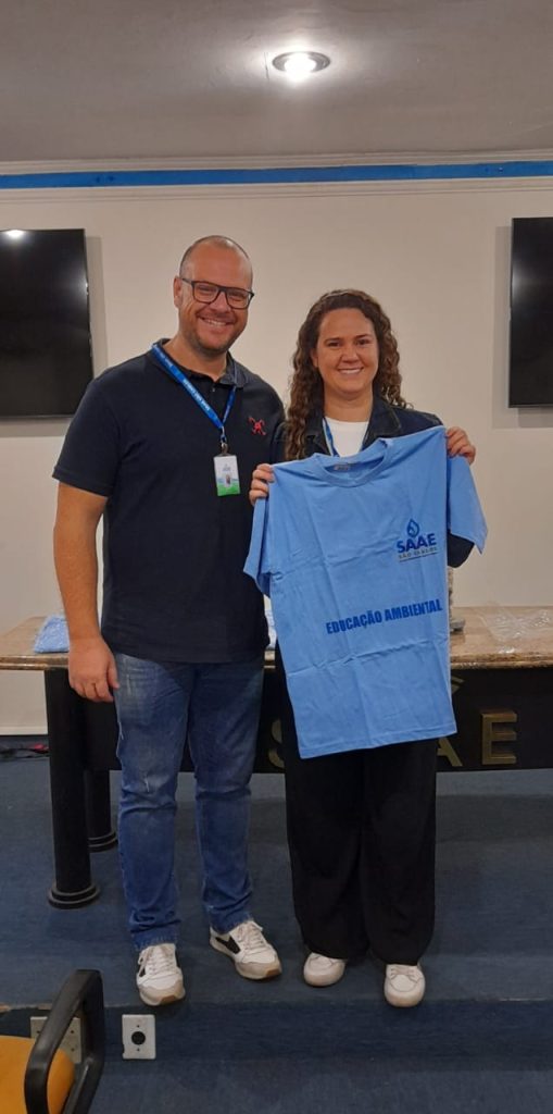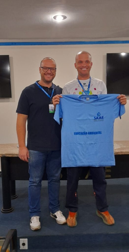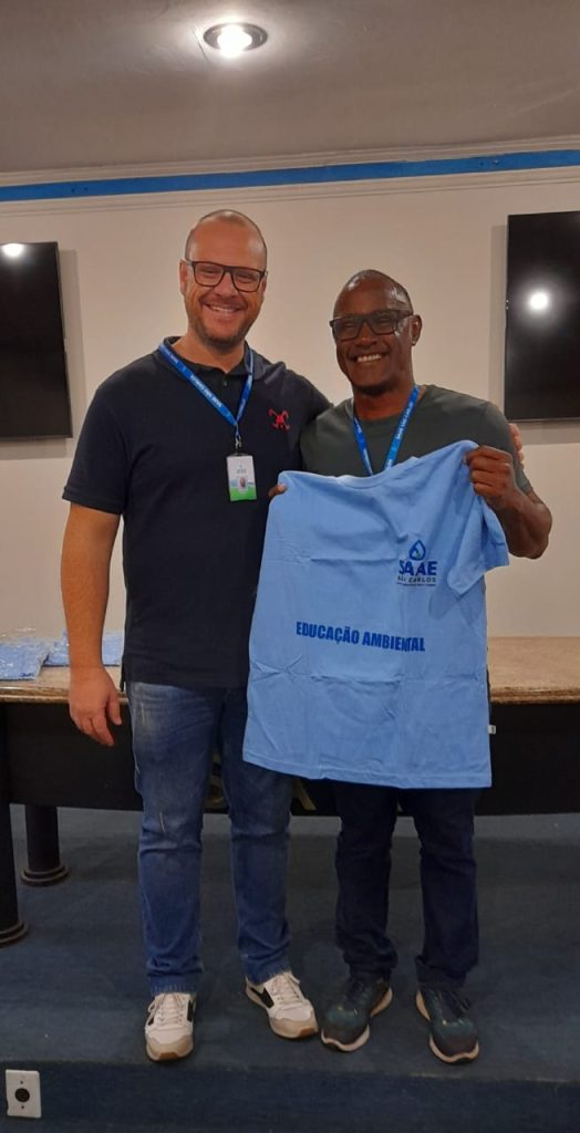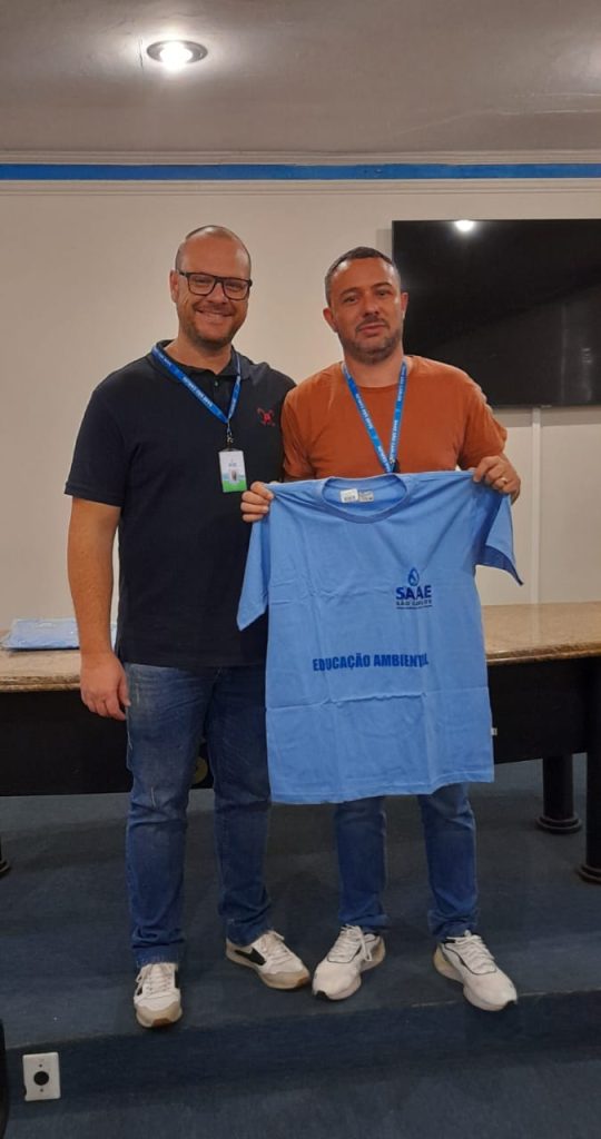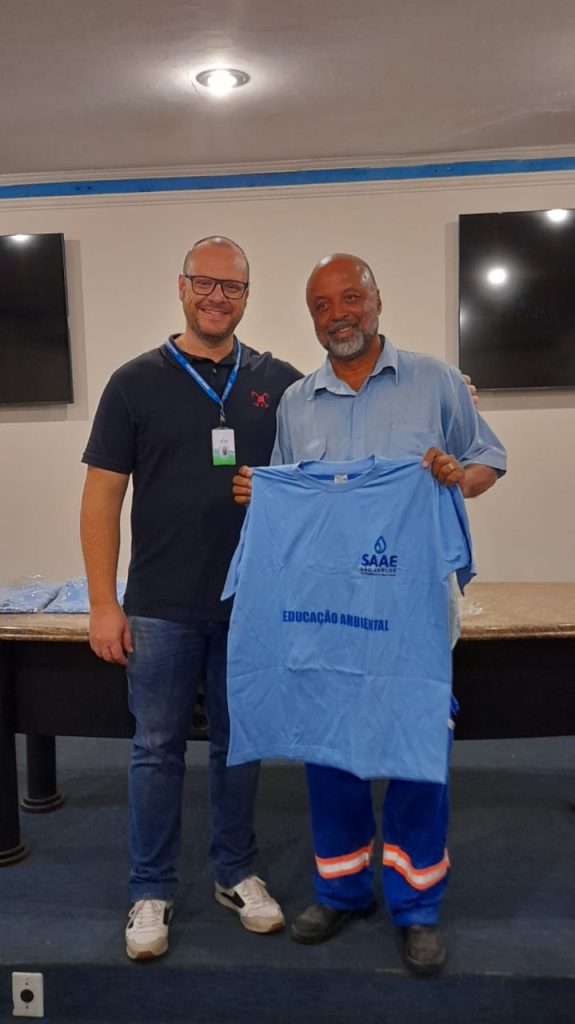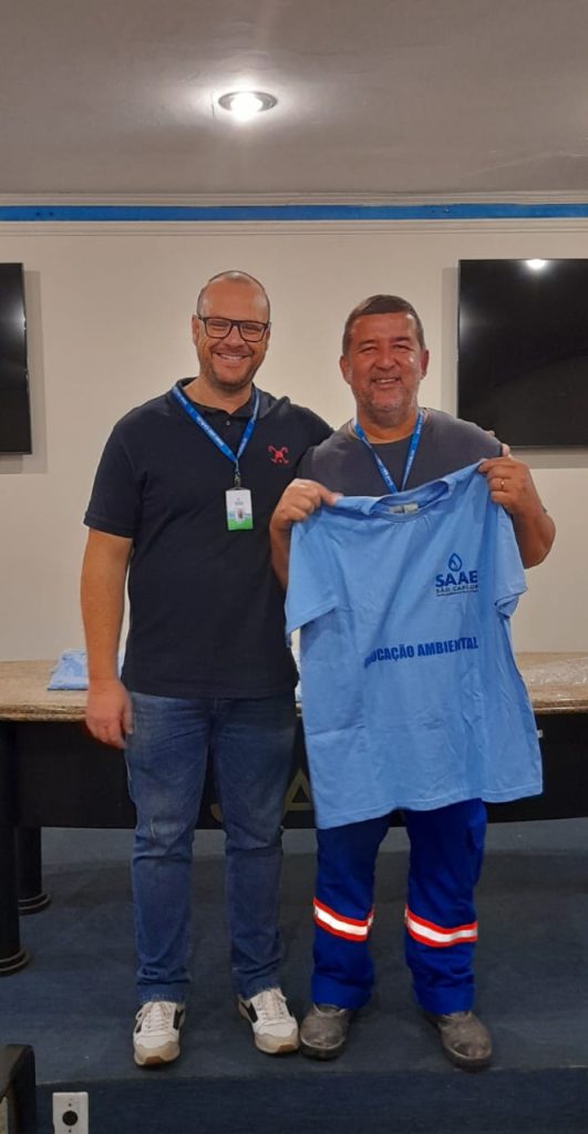 Na manhã de sexta-feira, 22/08, na Estação de Tratamento de Água – ETA Vila Pureza, localizada na Avenida Dr. Carlos Botelho, nº 1.201, o presidente do Serviço Autônomo de Água e Esgoto de São Carlos (SAAE), Derike Contri, acompanhado do Superintendente de Engenharia e Gestão Técnica – SEGeT, Dirceu Azzolini Filho, entregou camisetas aos servidores que atuam nos projetos de Educação Ambiental da autarquia. Esses profissionais, além de servidores do SAAE, dedicam-se de forma voluntária às ações educativas. Desde o início do programa, mais de 6 mil crianças já participaram das atividades, sendo que mais de 1 mil estiveram envolvidas apenas neste ano de 2025.