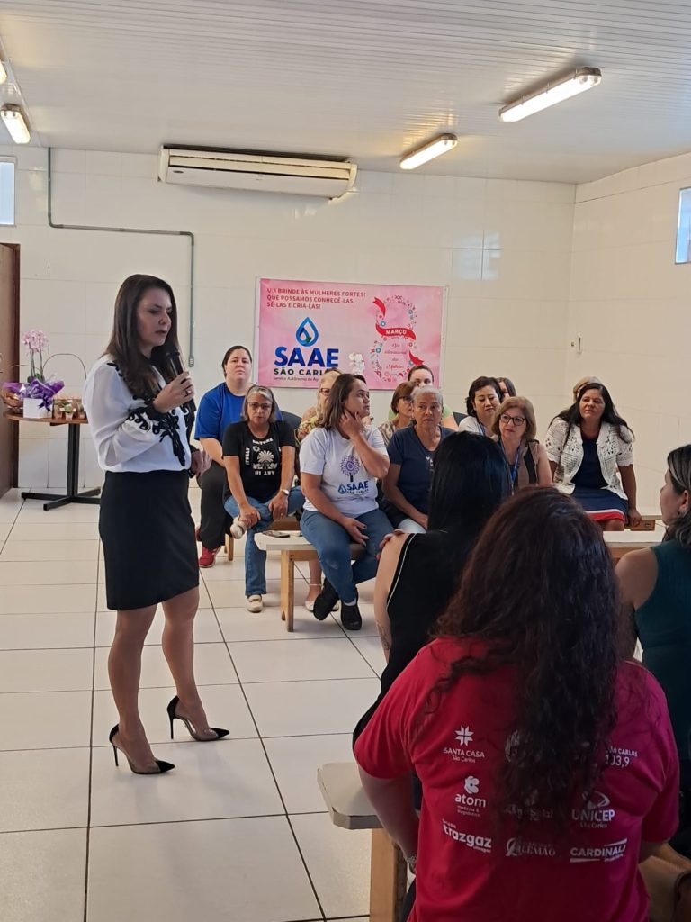 Em alusão ao Dia Internacional da Mulher, celebrado em 8 de março, o Serviço Autônomo de Água e Esgoto de São Carlos (SAAE) realizou, na manhã desta quinta-feira (5), a palestra “Feminicídio, Leis e Direitos das Mulheres”, ministrada pela advogada e presidente da OAB – Subseção São Carlos, Andréa Izilda Martos Valdevite. A iniciativa teve como objetivo promover reflexão sobre os direitos das mulheres, os mecanismos de proteção existentes e os desafios que ainda persistem no enfrentamento à violência de gênero.