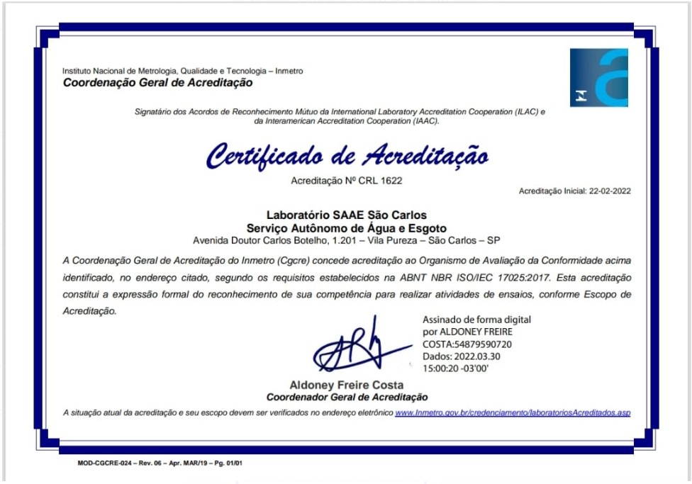 LABORATÓRIOS/SAAE – Os laboratórios do SAAE São Carlos são acreditados junto a CGCRE de acordo com os requisitos da norma ABNT NBR ISO/IEC 17025-17. Esta norma apresenta as exigências gerais para garantir a competência de laboratórios de ensaio e confere reconhecimento e acreditação às análises realizadas. A ISO 17025 tem como princípio a padronização do processo analítico e a melhoria contínua do sistema, em busca, sempre, da maior eficiência. Essas avaliações acontecem a cada dois anos.